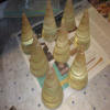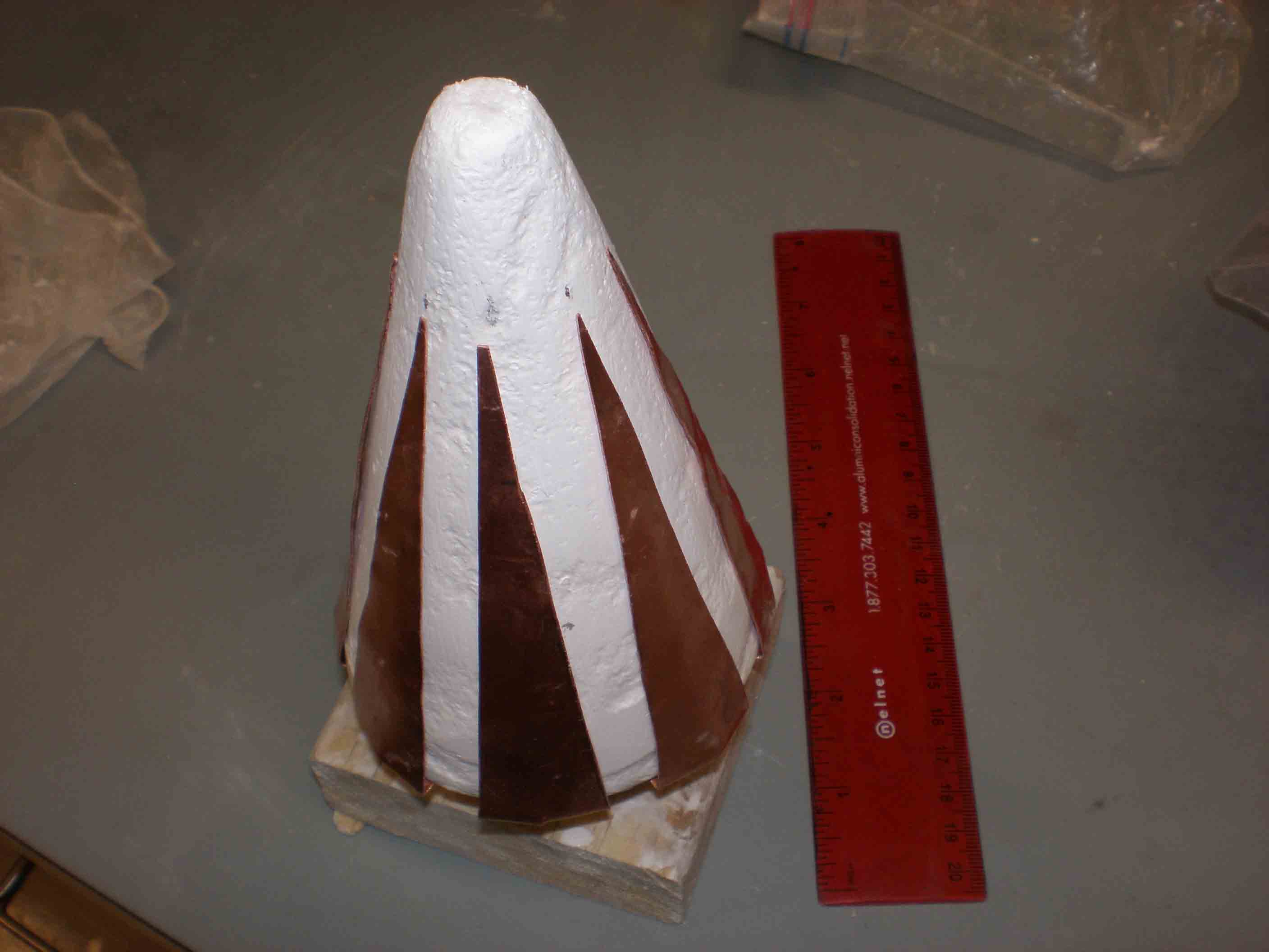 Next comes the Mark 2 antennas; 10 ga. copper wire embedded in epoxy, forming a cone (much less truncated than the previous helix), then coated in a silica composite ceramic. This also fires off at the base, but in this case the base does not burn as it is thick copper pipe and plate. Then I added copper triangles to extend the plasma along the antenna. This shield functions as a kind of balun; it helps ensure that the impedance of the antenna varies along its length, thus matching the environment somewhere at all times. I found that this initial triangle pattern works well but would be improved if extended very near to the tip, so now I'll take 4 of the 8 triangles off, replace them with bigger and longer ones, and try again. Finally after that's optimized I'll try coating the shield with ceramic and see if it makes enough difference to merit the bother and expense.