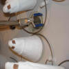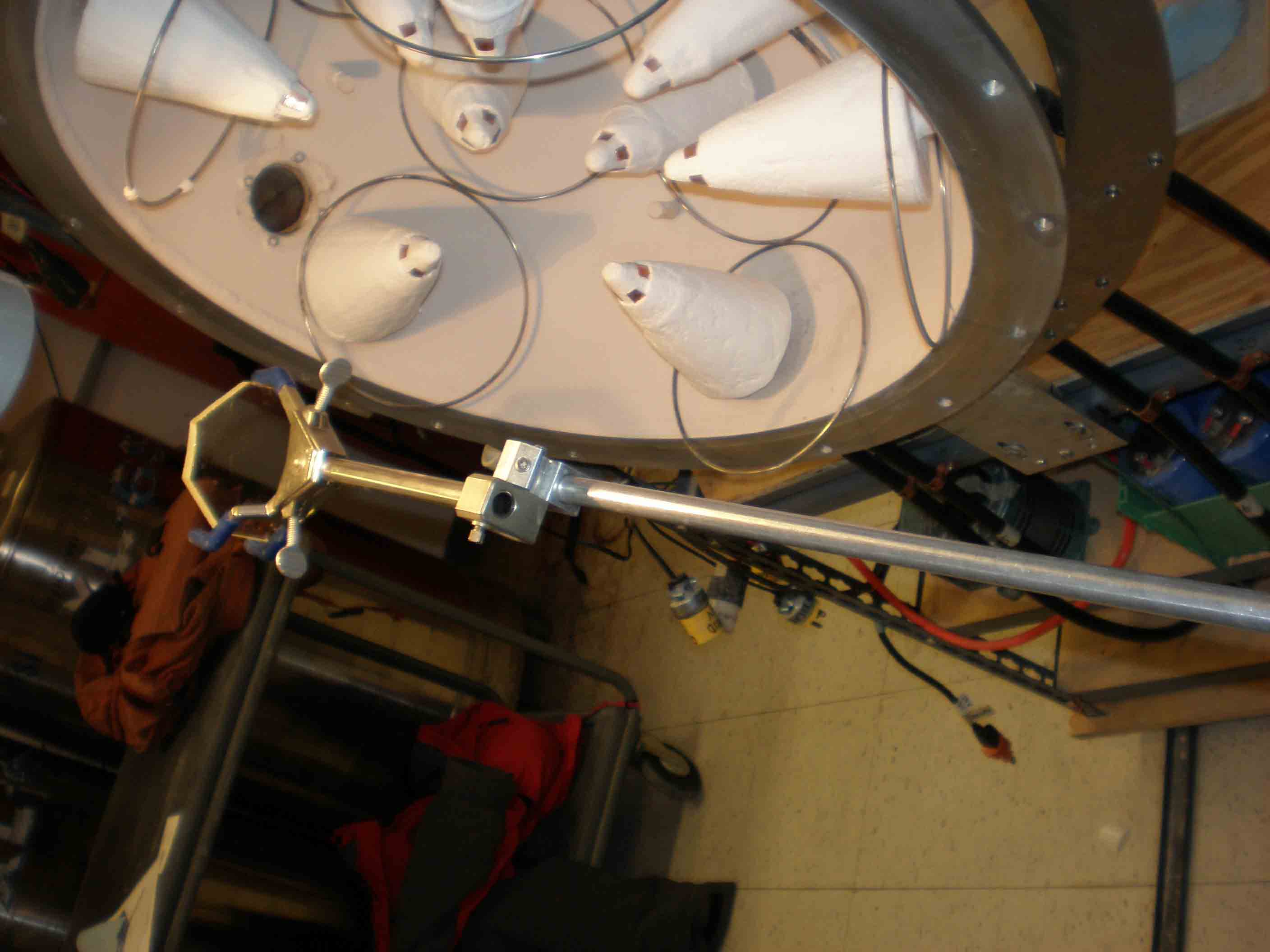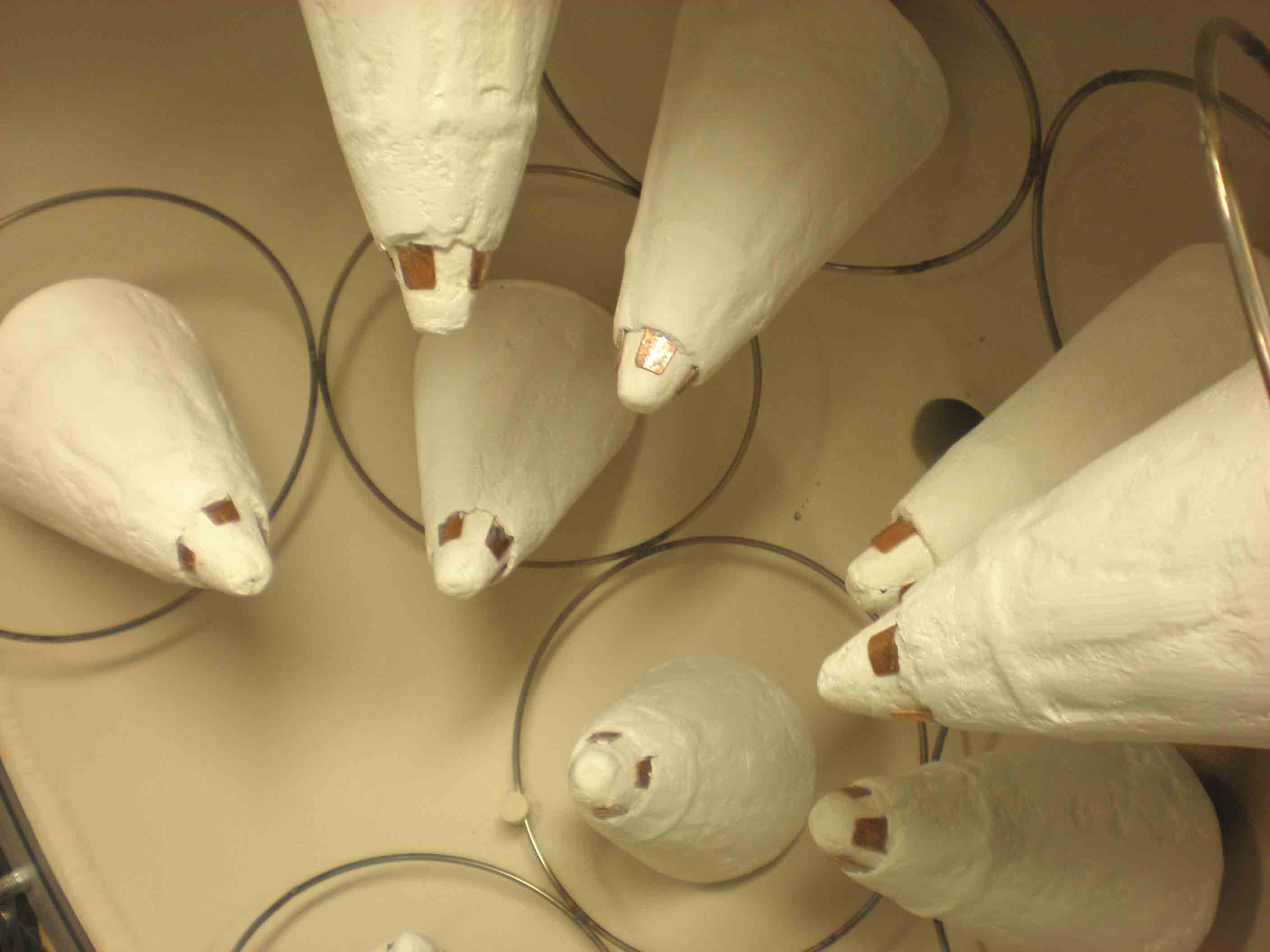 At the end of September, the new Mark II antennas had the epoxy core (with its embedded conical helix of copper wire) coated with silica ceramic composite, over which is a shield of copper sheet metal triangles and a sturdy base of copper sheet metal and copper pipe. This pipe is brazed onto a brass bushing that screws into the wall of the reactor.