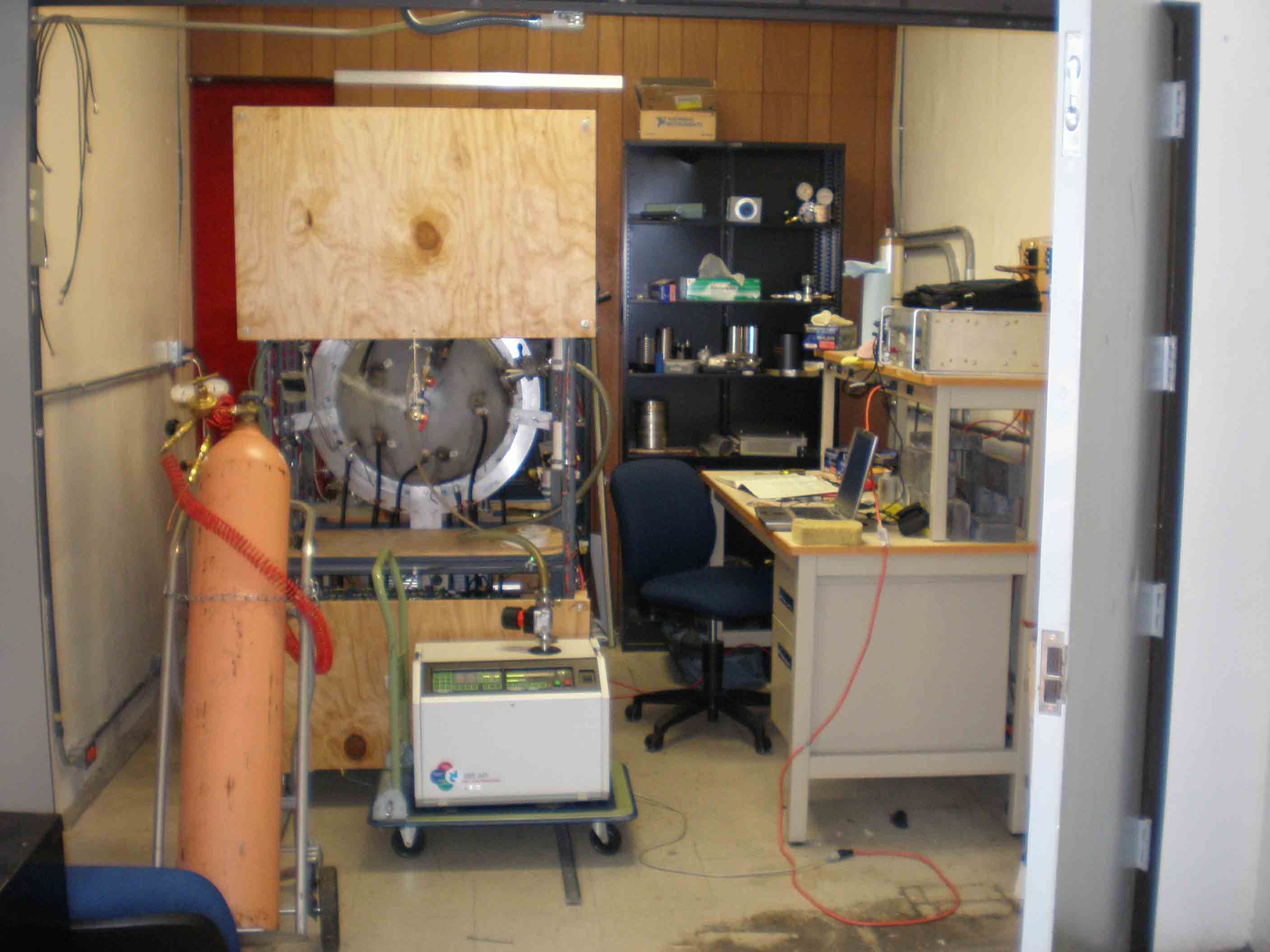 I moved the reactor to a small adjoining room since access to the shielded target room is sometimes interrupted for days at a time. Here I checked for leaks. The homemade windows were a problem, so I put in flanges and one has a store-bought window that works well. Eventually I got down to as low as 30 mTorr and could run a turbo pump; however I accidentally allowed the pressure to go up unexpectedly while running the turbo which damaged its power supply. A replacement turbo didn't work so well...