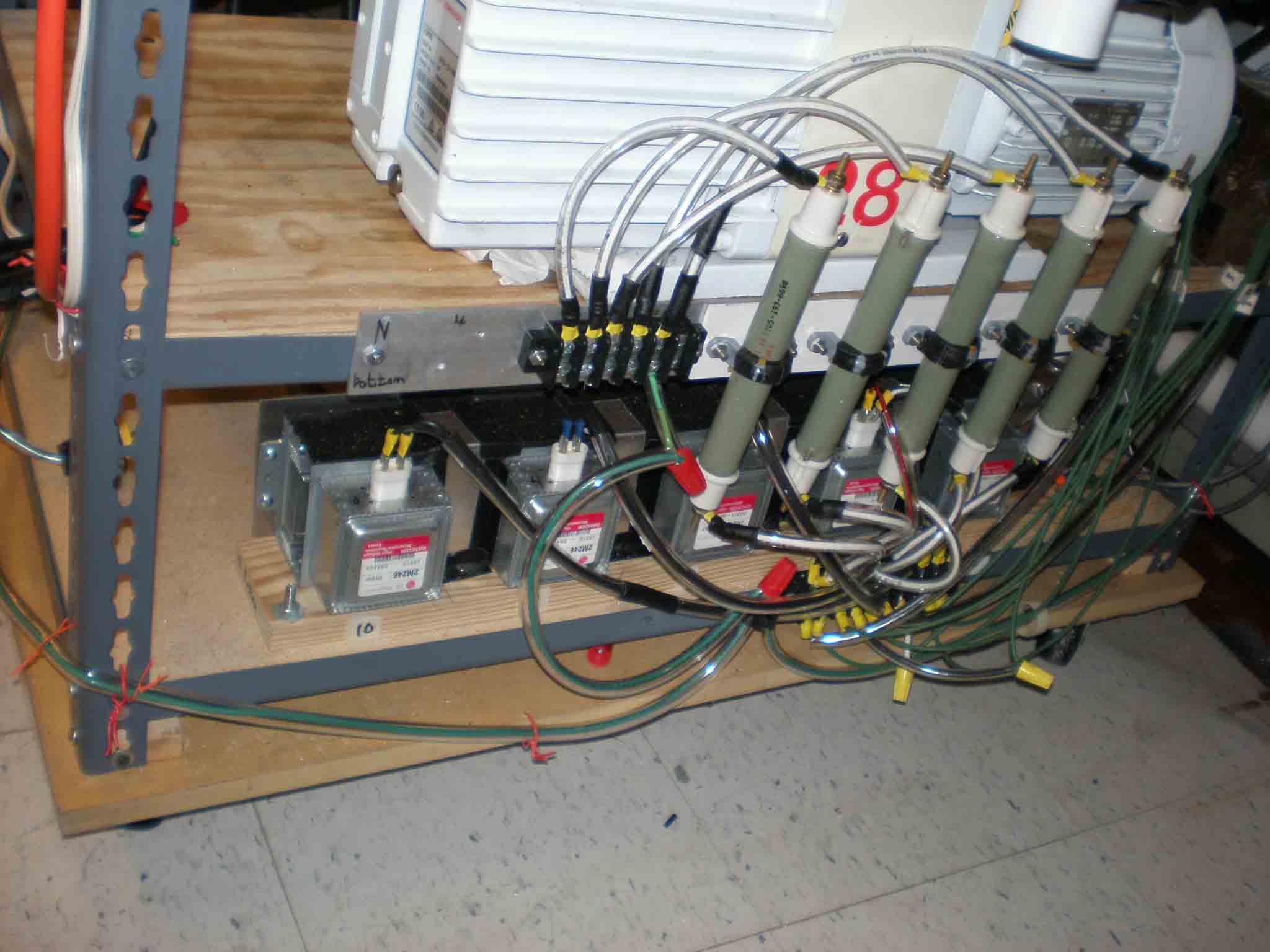 New arrangement of wiring and power distribution; see big new resistors (small older ones blew up), 500 ohms distribute current pulse among magnetrons; variac adjusts power to magnetron filaments (3VAC after another transformer)